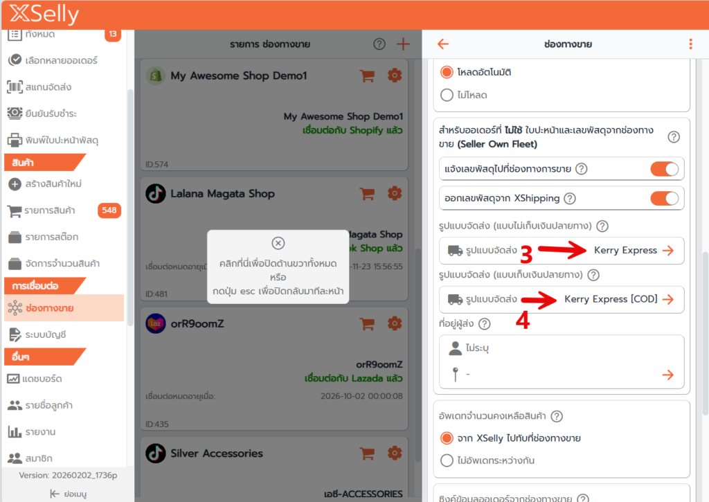 แอป XSelly → การเชื่อมต่อ → ช่องทางขาย