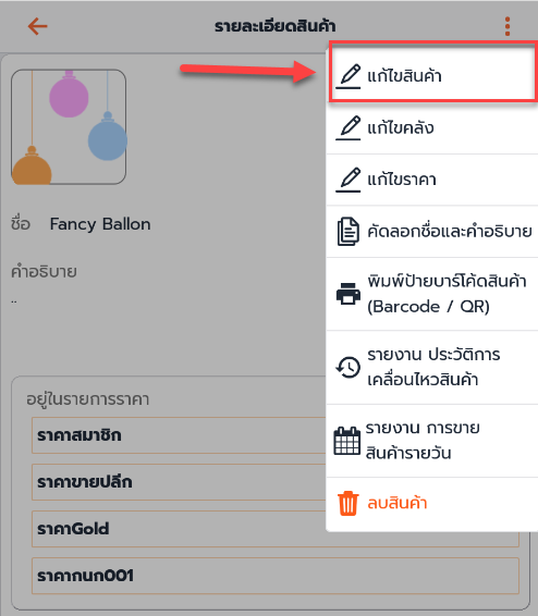 1. เข้าที่รายการสินค้าที่ต้องการแก้ไข กดที่จุดไข่ปลา3จุด เลือก แก้ไขสินค้า
