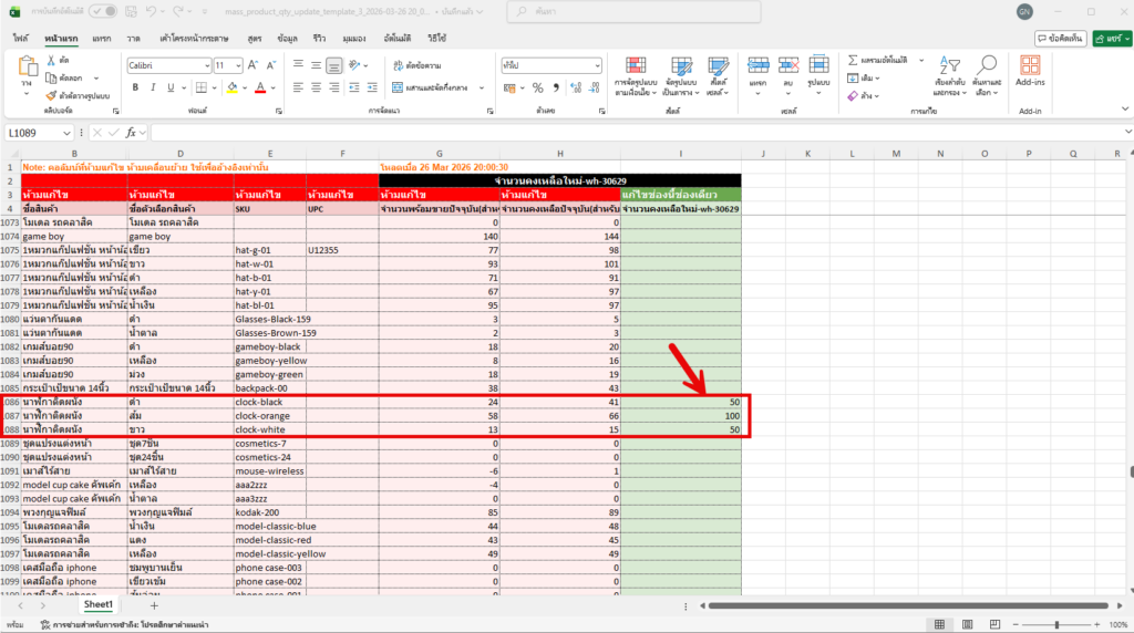 ขั้นตอนที่ 3.2 — เปิดไฟล์ Excel ที่ดาวน์โหลดมา แก้ไขจำนวนสต๊อกใน คอลัมน์ I (ช่องพื้นที่สีเขียว) จากนั้นบันทึกไฟล์เดิมทับ