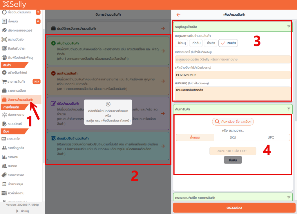 ขั้นตอนที่ 4.1 — เลือกเมนู จัดการจำนวนสินค้า จากนั้นเลือกประเภทการจัดการ เช่น เพิ่มจำนวน / ลดจำนวน / ปรับยอด