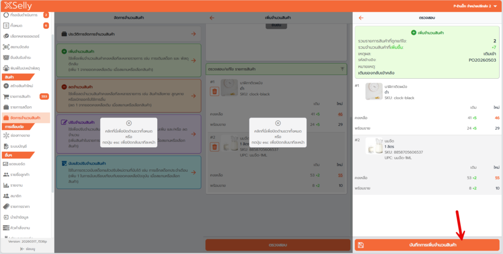ขั้นตอนที่ 4.3 — ตรวจสอบความถูกต้องของข้อมูลสรุป จากนั้นกด บันทึกการเพิ่มจำนวนสินค้า เพื่อยืนยัน