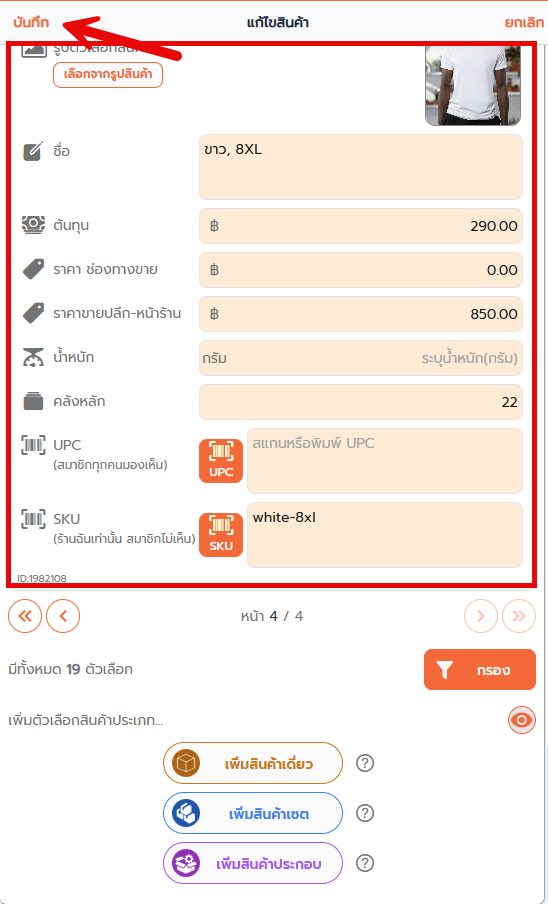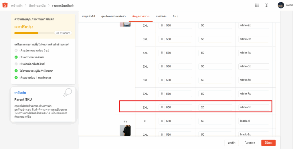 1. ไปที่ Seller Center ของช่องทางขาย เพิ่มตัวเลือกใหม่ ขาว 8XL และคัดลอกรหัสสินค้า SKU : white-8xl มาใส่ในช่อง รหัส SKU บนช่องทางขายให้เหมือนกันกับ XSelly แล้วกด บันทึก หรือ อัพเดทสินค้า