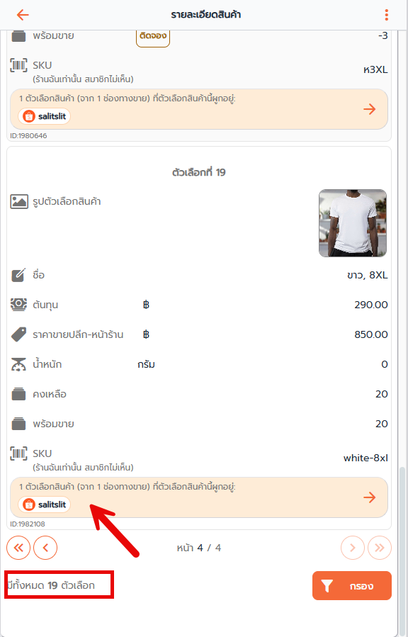 จะสังเกตว่า ตัวเลือกที่19 ขาว 8XL รหัสสินค้า SKU : white-8xl มีการผูกสต๊อกสินค้ากับช่องทางขายเรียบร้อย